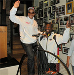 Vorne ein riesiges Rad, hinten ein kleines, Vollgummireifen und die Pedale direkt am Vorderrad. Ich fragte Jürgen Grünwald, den Eigentümer des Hotels: „Meinst Du, er könnte mal...?“ Wiederum kein Thema, wir schleppen das Teil in den Rittersaal, wo wir abwechselnd zwei große über alle vier Backen strahlende schwarze Buben auf dem Rad fotografieren. Davon werden sie bestimmt zuhause berichten. Dann geht es ans Abschiednehmen, was mir wirklich nicht leicht fällt.