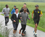 Hoffentlich quatsche ich ihm die Ohren nicht zu! Er ist einverstanden, daß ihn jeder mal führt und signalisiert so großes Gottvertrauen. Ich bemerke aber, daß Joseph sehr aufmerksam ist und aus dem Hintergrund schon mal der eine oder andere Zusatzhinweis in Kikuyu-Sprache kommt. Heike fährt auf dem Rad immer ein Stück voraus und hält die Szenen in Bild und Film fest. Peggy fällt etwas ab. Henry kennt kein Pardon, selbstverständlich wird auf sie gewartet. „Peggy, wir laufen jetzt Dein Tempo!“ Und Peggy strahlt. So ist eine knappe Dreiviertelstunde schon wieder um, kaum daß der Lauf begonnen hat. Zufriedene, beeindruckte Mienen, wohin ich auch schaue.