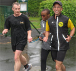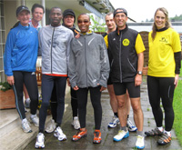 Wir werden jetzt versuchen, mit Bengt für den August 2010 ein solches Paket zu schnüren, das es für einen Sponsor interessant macht, die Reise zu finanzieren, v.a. die Flüge. Ja, man glaubt es kaum: Es ist wirklich ein Thema, zunächst jemanden dafür zu finden. Oh, welche Unterschiede zu der sehenden, gut verdienenden Sportlerwelt! Auf der anderen Seite: Einem sehenden Spitzenläufer kommt man bestimmt nicht so nahe. Und ob der auch derart nett ist? Bengt kommt erst in einer halben Stunde, um uns abzuholen. So beschließen wir, noch dreißig Minuten dranzuhängen. Ist das super, ich mit zwei Kenianern im Schlepptau! Am Wendepunkt besuchen wir noch eine kleine Kapelle, wo trotz mittlerweile Dauerregens die Kontaktaufnahme nach oben zu funktionieren scheint. Bengt holt uns dann ab und bringt uns zurück nach Waldbreitbach.