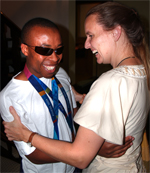 Henry Wanyoike besucht die Jugendlichen der Karl-Preising-Schule im Rehazentrum Bathildisheim.