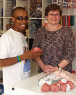 Kommalein (l) und Frau Friedewald (r) versorgen Henry mit Wolle. Henry